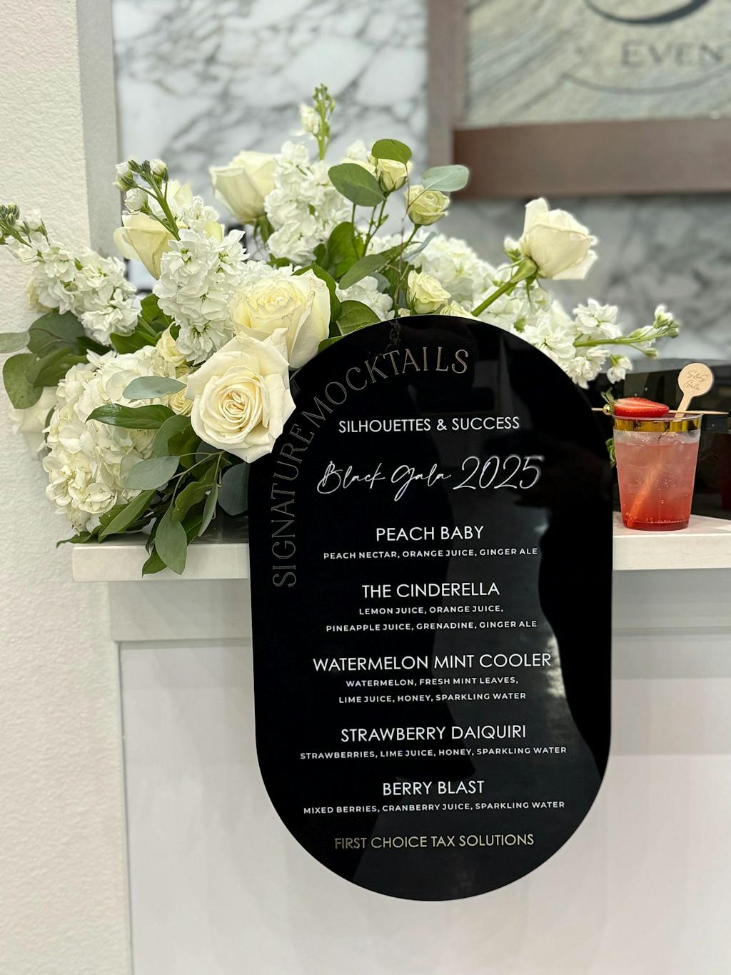 This floating black acrylic wedding bar sign features a unique invisible stand design that allows the oval menu to overhang your bar edge. Perfect for modern cocktail hours, this signature drink sign combines high-gloss black acrylic with crisp white text for maximum readability.